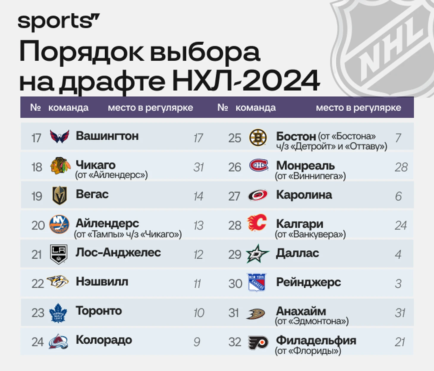 ● финалист Кубка Стэнли выбирает 31-м, а чемпион получает 32-й пик.