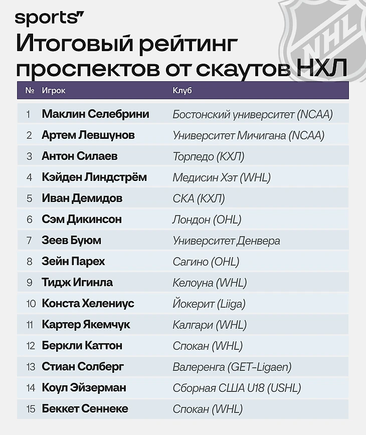 На драфте-2024 в этом клубе вряд ли случится пополнение: под первым номером практически гарантированно уйдет канадец Маклин Селебрини. Но двое россиян все равно котируются очень высоко: в финальном рейтинге проспектов от журналиста The Athletic Скотта Уилера третьим идет Антон Силаев из «Торпедо», а четвертым – Иван Демидов из СКА.