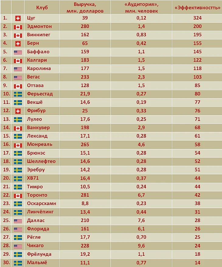 Клубы швейцарской NL получают от телетрансляций 33 млн. долларов в год. Население Швейцарии – 8,8 млн. человек. «Эффективность» контракта – 3, млн. долларов с миллиона человек. Вдвое больше, чем у НХЛ в США.