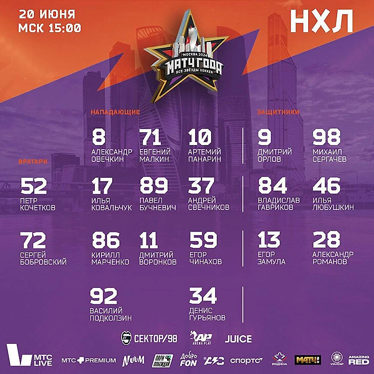 По названию и подаче можно подумать, что встреча собрала всех звезд российского хоккея. Это не совсем так: среди звезд НХЛ не было Кучерова, Василевского, Ничушкина и Капризова. За КХЛ не сыграл главный бомбардир сезона-2023/24 Никита Гусев – все еще раздумывает над будущем и ищет варианты в НХЛ. Но даже без них получился уникальный состав.