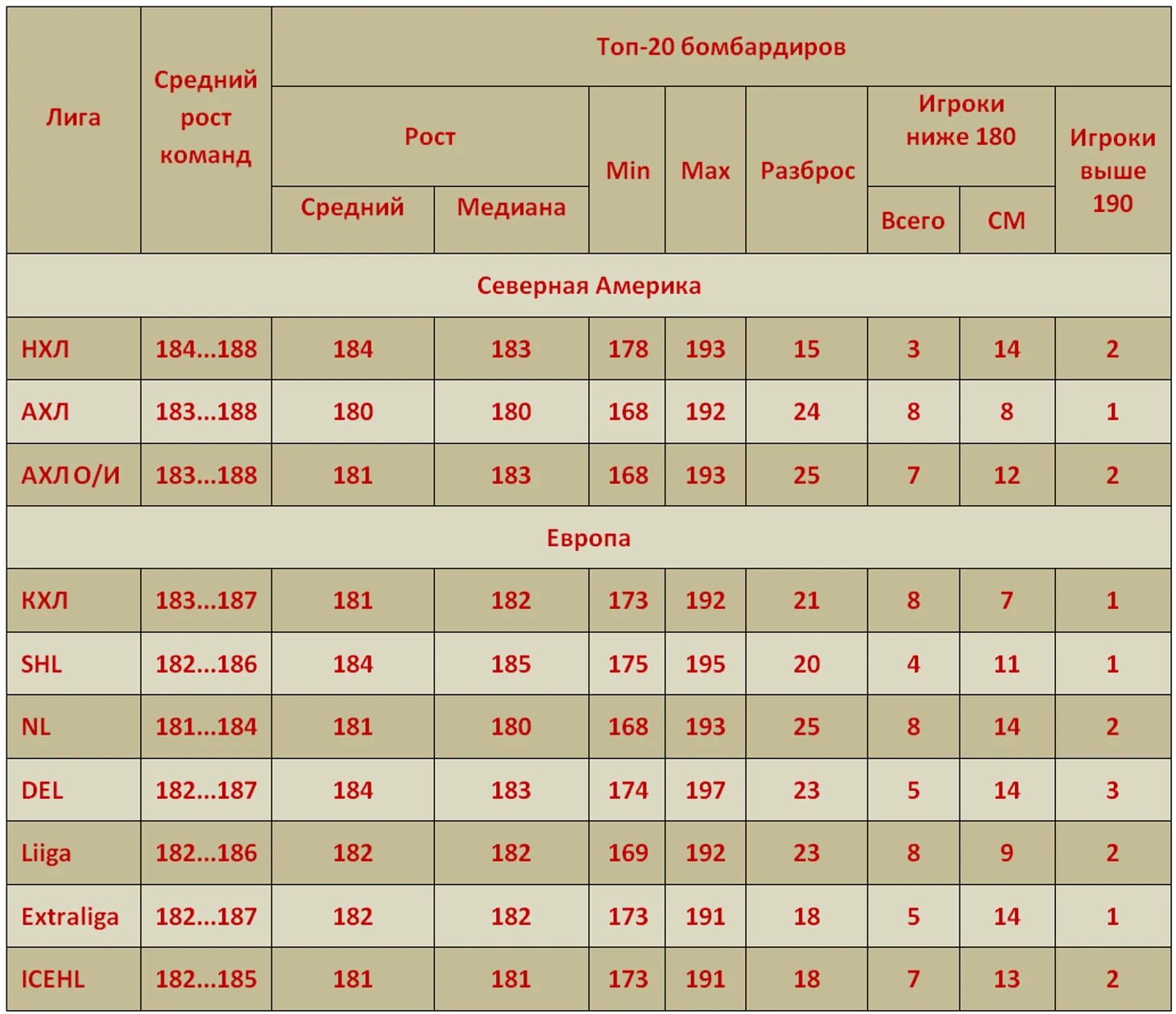 Их оказалось немного для "статистического вывода" - единственное, что можно сказать по тому, что я собрал. Хотя, когда начинал считать, думал, результат будет немного другой. Расширять статистику я не стал - больше интересовали маленькие - но сведения в табличке оставил. Любопытно, да, что в некоторых европейских лигах попадаются рослые бомбардиры выше, чем в НХЛ. Ну и для оценки разброса они были нужны. Примерно такой комментарий можно дать.