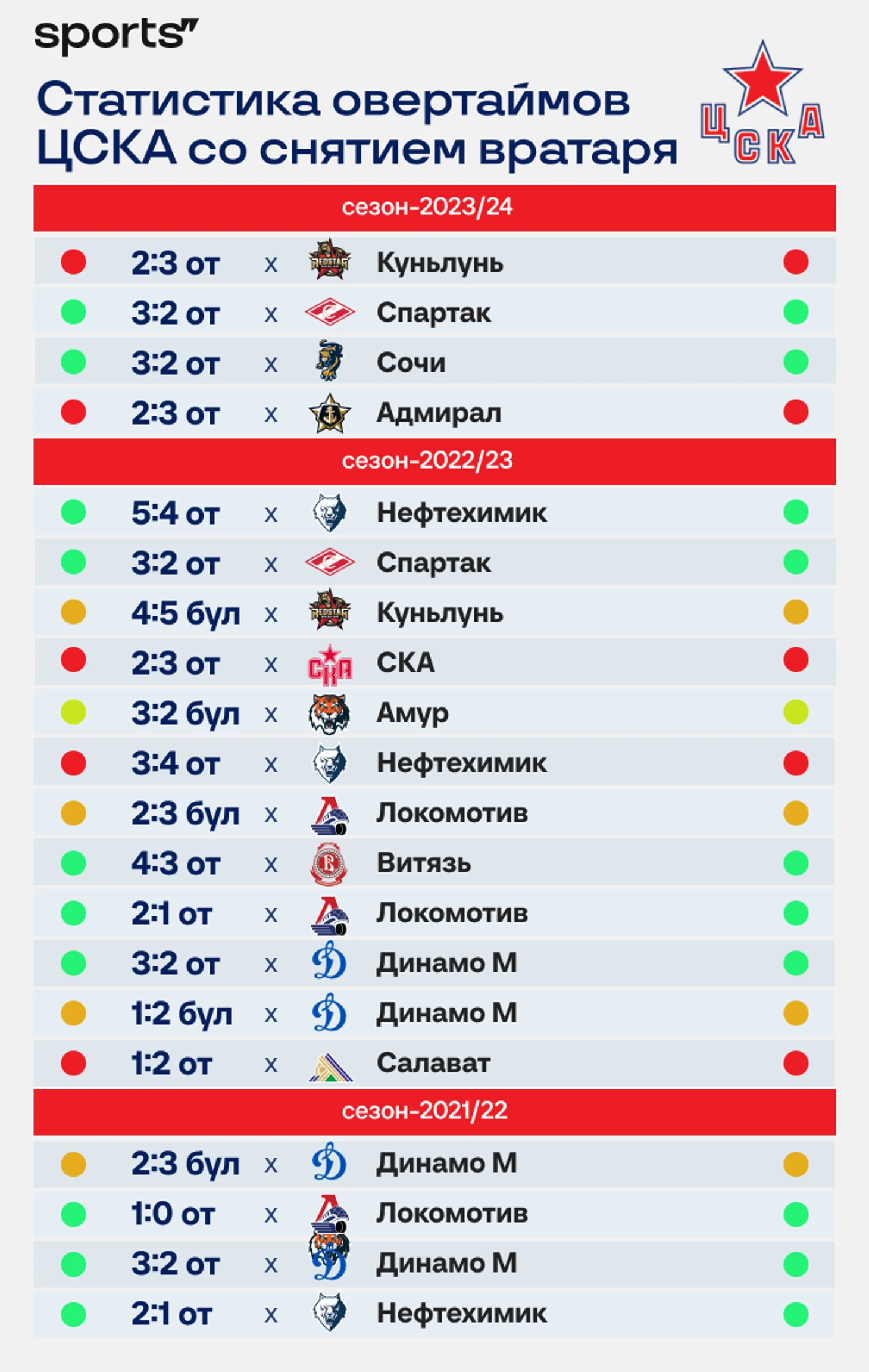 Всего за эти три сезона ЦСКА 20 раз прибегал к замене вратаря в дополнительное время. В большинстве случаев ЦСКА все-таки побеждал (10), но пять раз все заканчивалось проигрышем. Еще пять доходило до буллитов, где ЦСКА вовсе выиграл только однажды.