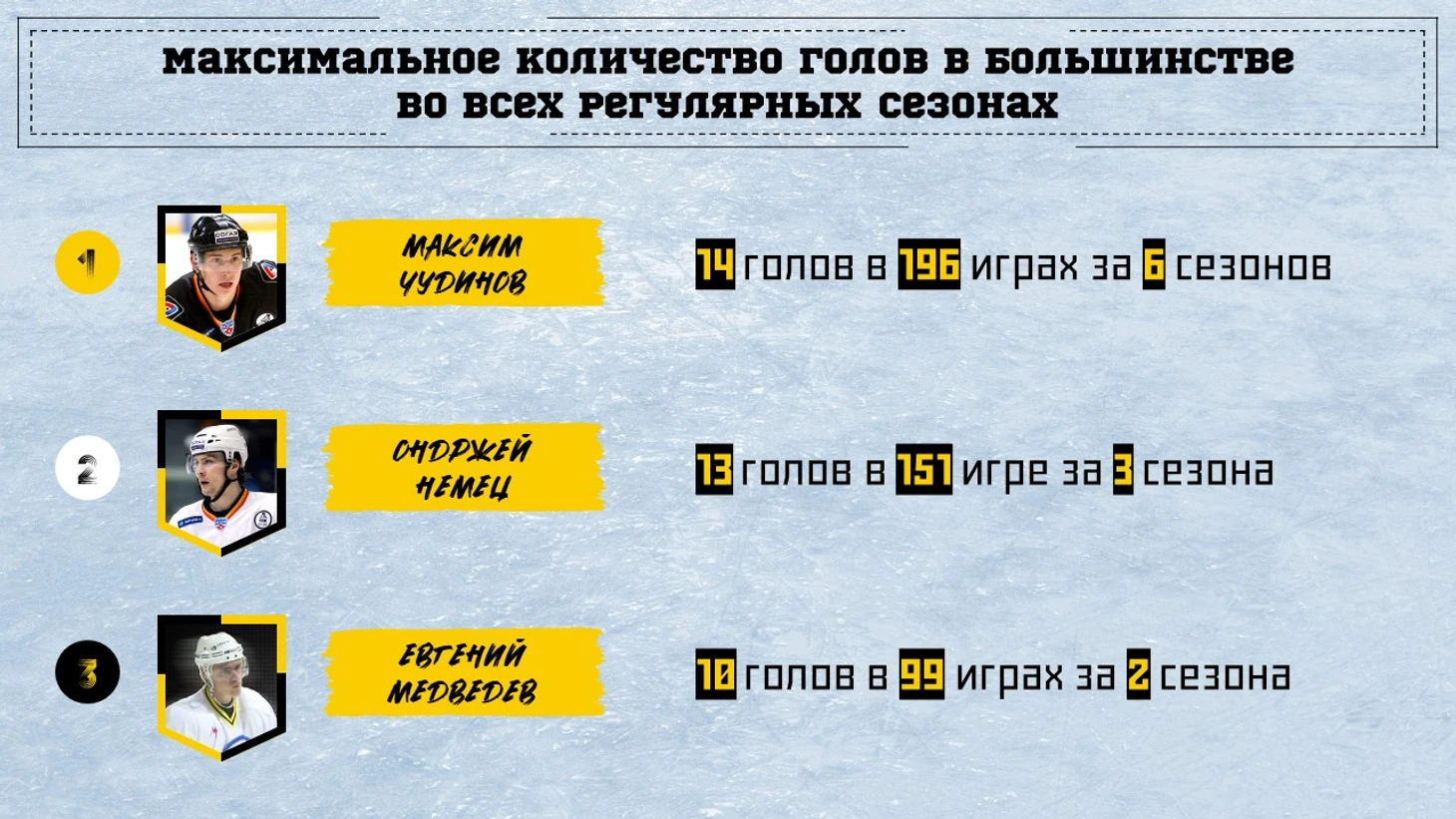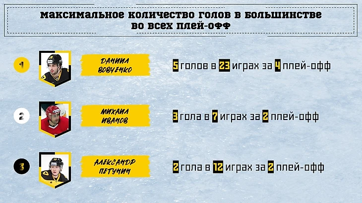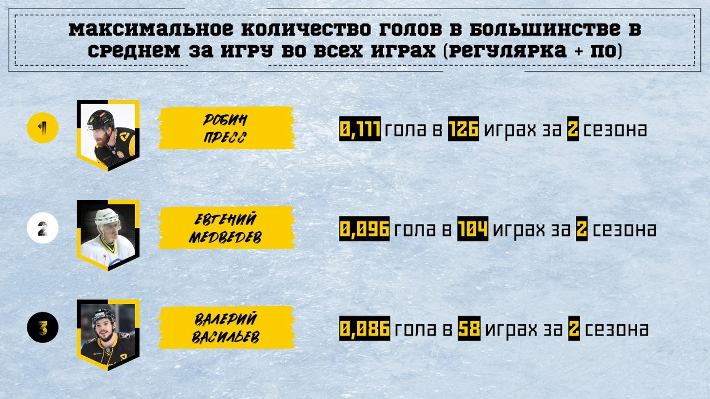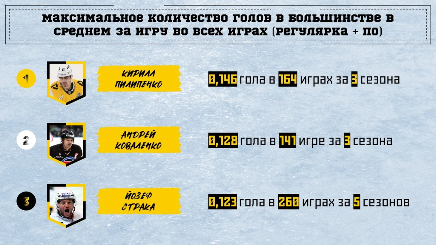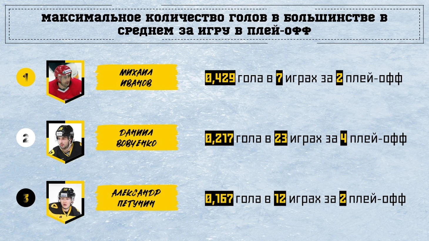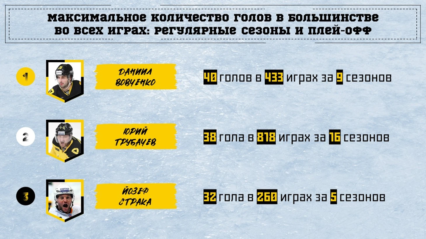По сумме голов в большинстве за все сезоны на первом месте уже Вовченко – смог обогнать Трубачева за счет более результативной игры в плей-офф.