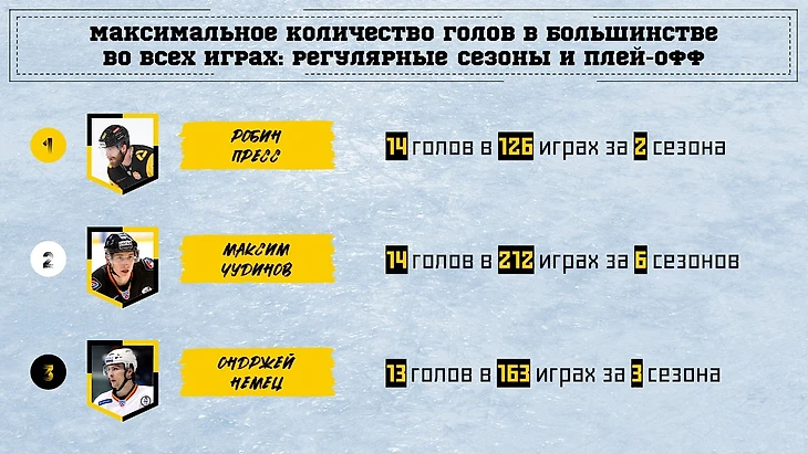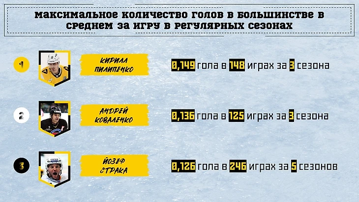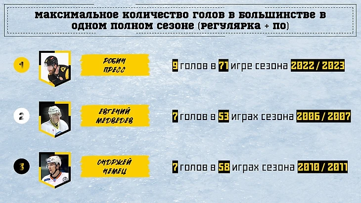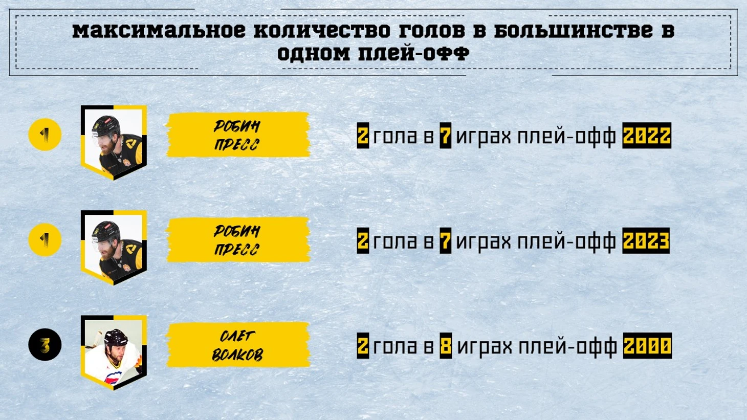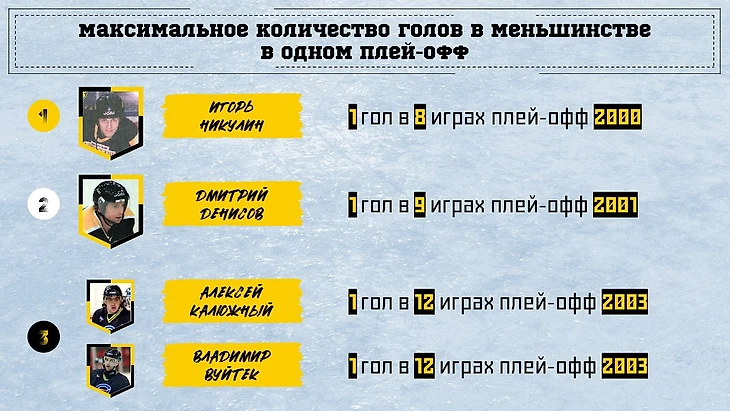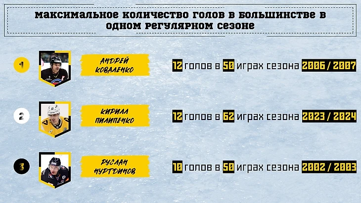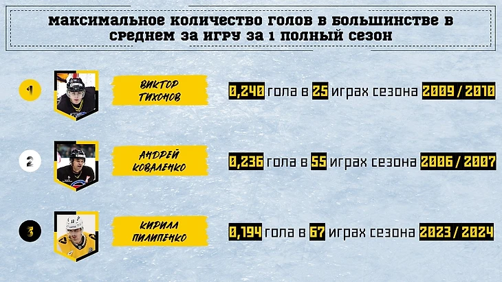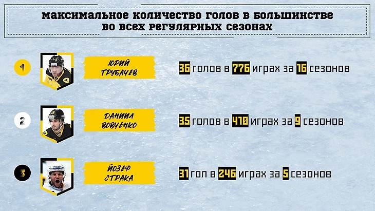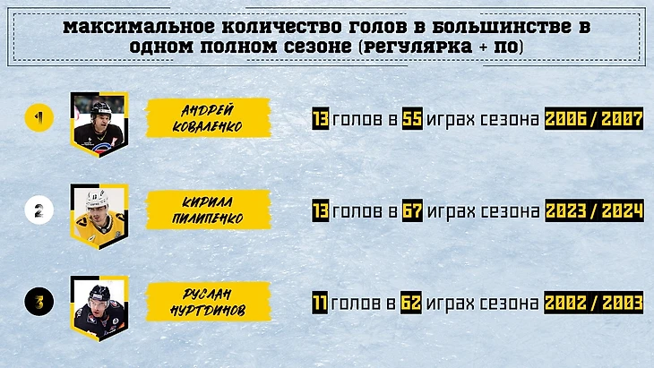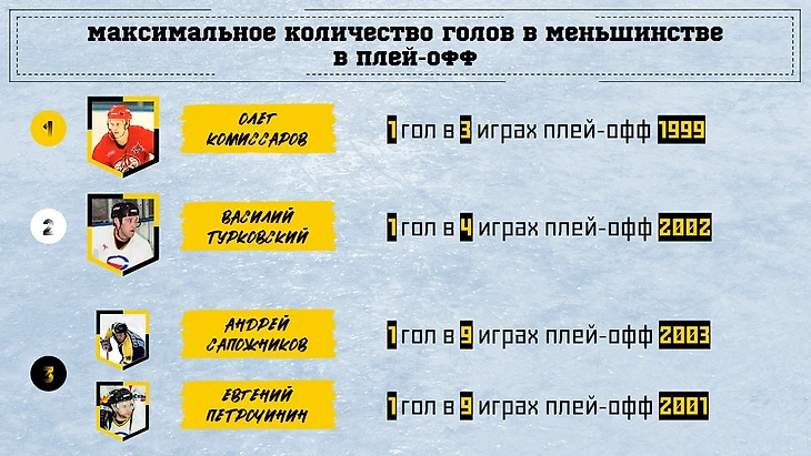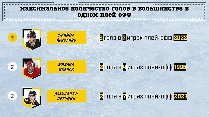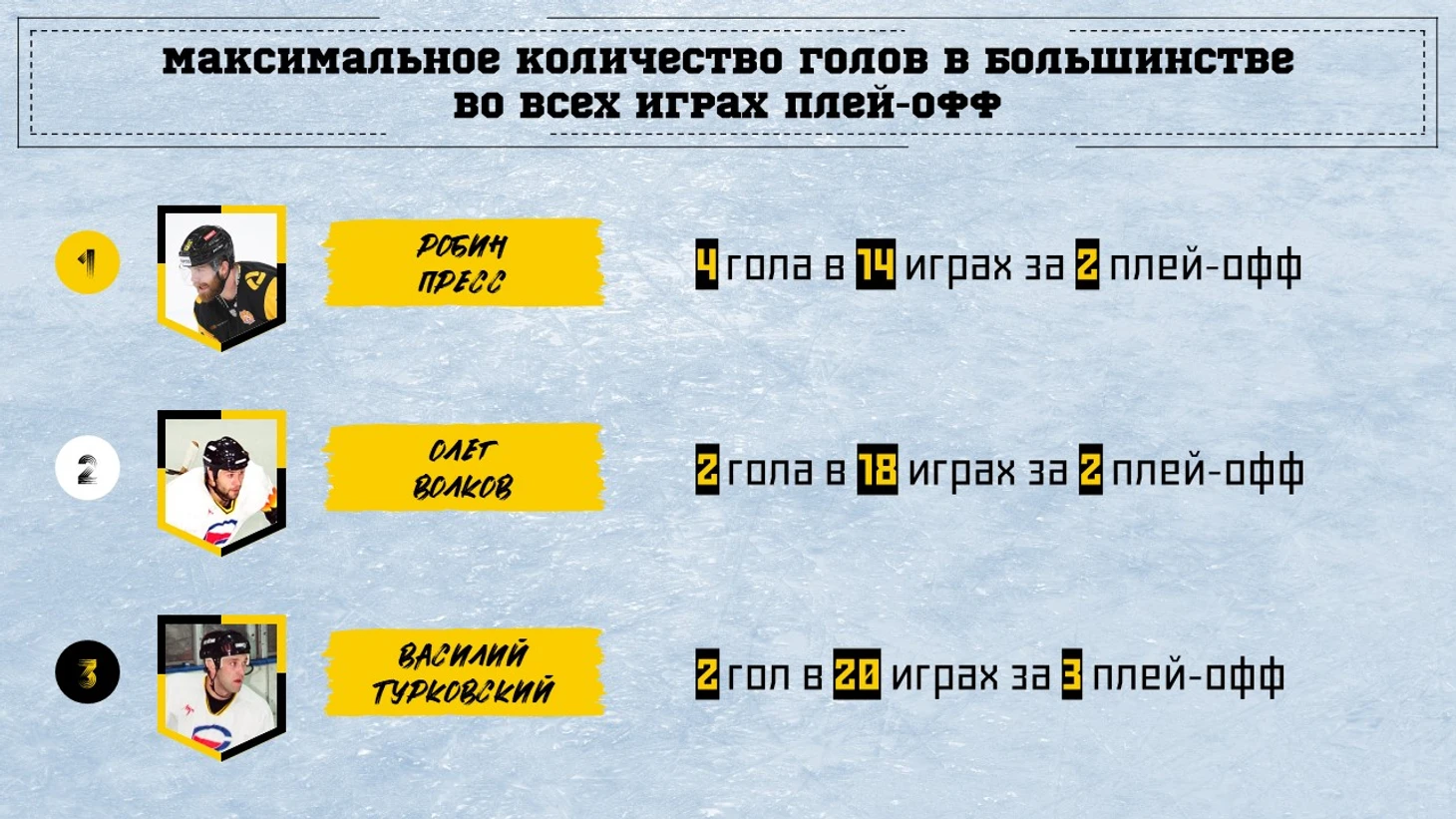По сумме голов в большинстве за все сезоны на первом месте уже Вовченко – смог обогнать Трубачева за счет более результативной игры в плей-офф.