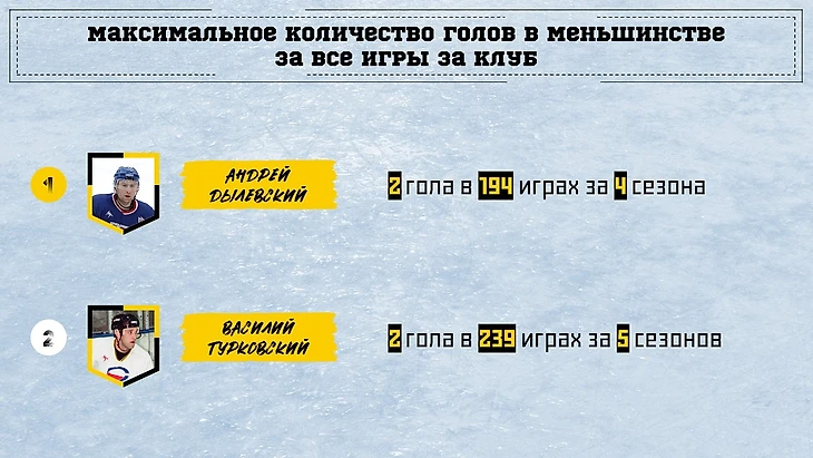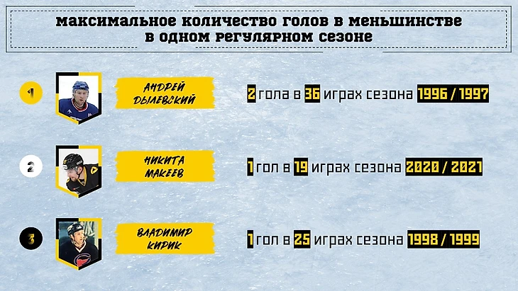 Начнем с количества голов в меньшинстве за 1 регулярный сезон. Тут вне конкуренции Андрей Дылевский – он единственный смог забить больше 2 шайб.