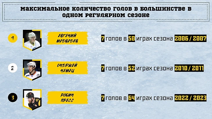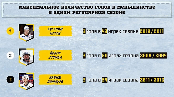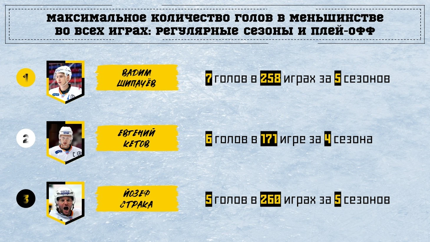 Если же смотреть на результаты всех игр за всю историю – Вадим Шипачев выходит в лидеры, он успел забить 7 голов. Йозеф Страка единственный, кто отметился в рекордах и по голам в большинстве и в меньшинстве.