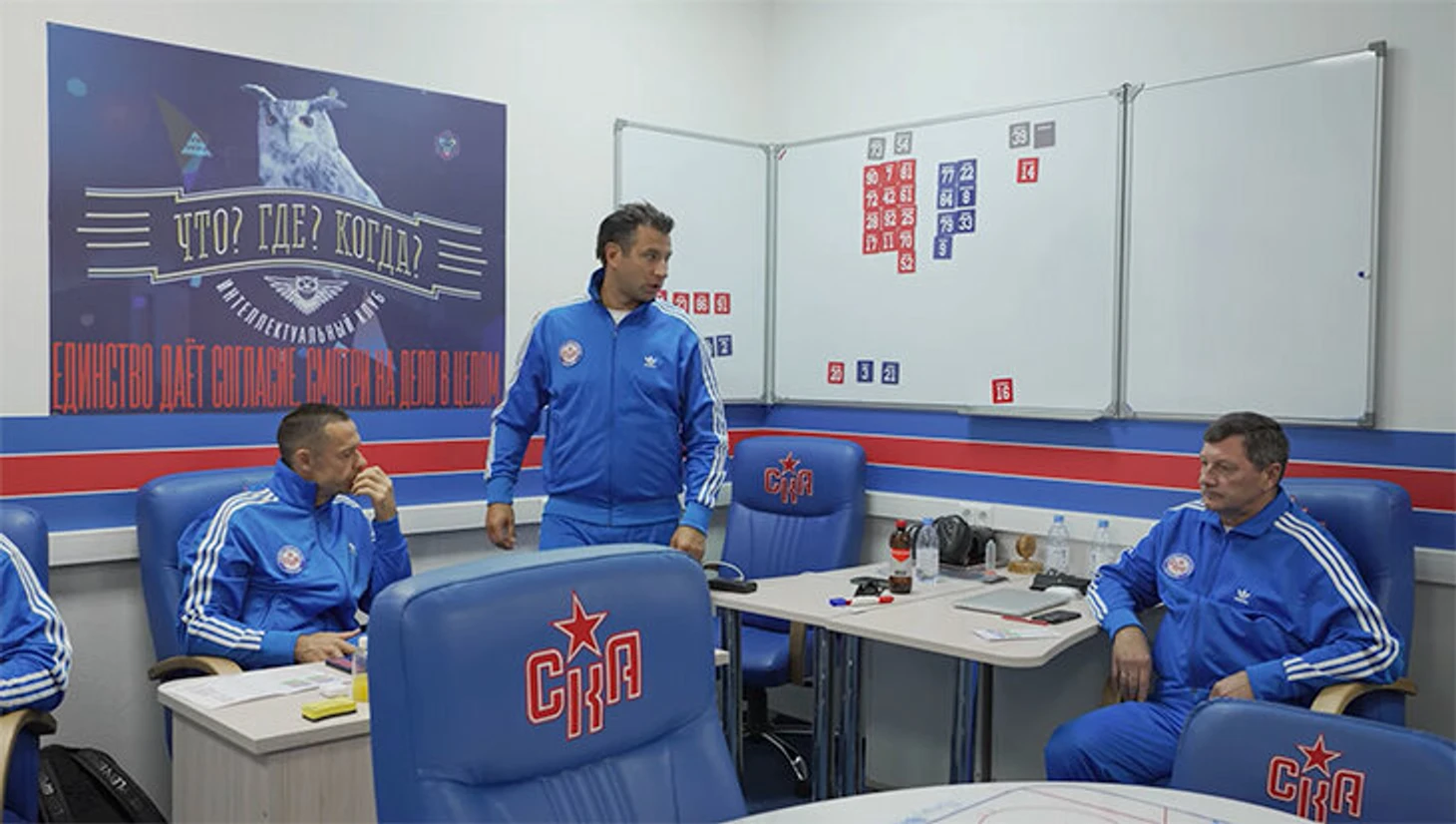 Перед началом игры главный тренер СКА общается с помощниками – Альбертом Лещевым и Константином Шафрановым. Сначала – диалог по меньшинству с первым из них.