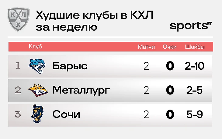 Худшие клубы: «Барыс» и «Сочи» всем проигрывают, «Металлург» не справляется без лидеров