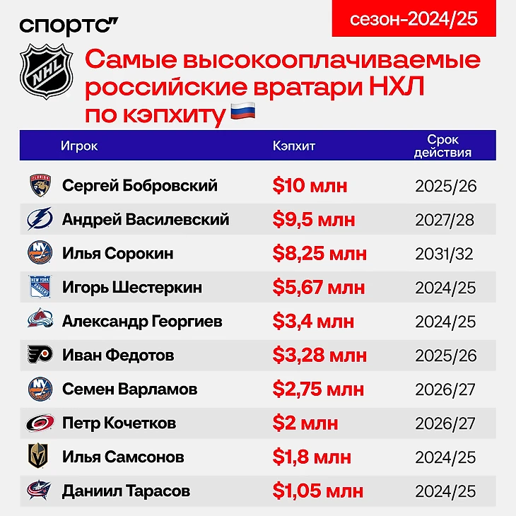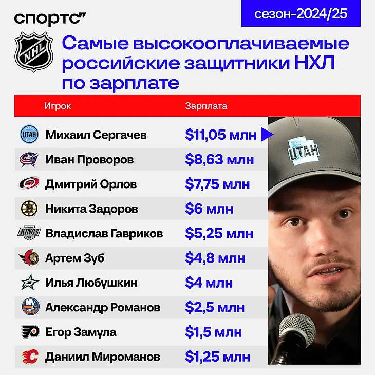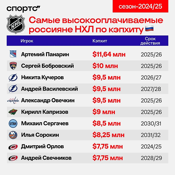 И здесь сохранились все десять, но вновь с перестановками. На пятом месте теперь не Георгиев, а – внезапно – Иван Федотов, который за «Филадельфию» не провел не то что ни одного полного сезона – ни одного даже полного месяца. Иван заработает $3,28 млн за регулярку-2024/25 – это огромный аванс.