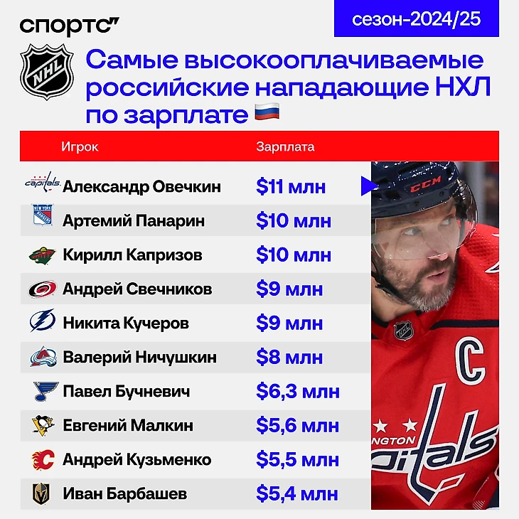 Овечкин с 11 млн – второй по зарплате в сезоне среди русских. Больше только у Сергачева в «Юте»