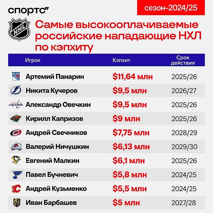 Если учесть, что россияне представлены в НХЛ не столь массово, как, например, канадцы, топ достойный. Первые пять позиций – из прошлой таблицы, шестой – Валерий Ничушкин, который начнет сезон позже остальных из-за программы помощи. За ним – Малкин, один из лидеров «Сент-Луиса» Бучневич, получивший новое начало в «Калгари» Кузьменко и Барбашев из первого звена «Вегаса». У всех кэпхиты от $5 млн, все играют в топ-6 своих команд – и это отличный показатель. По защитникам и вратарям такого не будет.