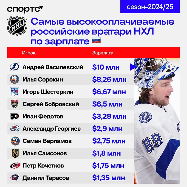 ● После Георгиева расположился Иван Федотов, и его $3,28 млн – пока огромный аванс. В НХЛ у него всего 3 матча, но для «Филадельфии», очевидно, было важно показать, насколько она верит во вратаря. Иван обогнал даже опытного и проверенного Семена Варламова – ветеран отстал больше чем на полмиллиона.
