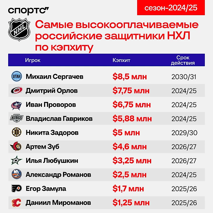 ● А вот остальной список было бы сложновато назвать по памяти. Любушкин часто меняет клубы и практически всегда подписывается на один год, но теперь за него можно от души порадоваться: и насыпали прилично, и срок – три года. За ним – Егор Замула, лишь в прошлом сезоне ставший основным в «Филадельфии». Замыкает десятку Даниил Мироманов, который играл бы в основе любой команды НХЛ, кроме «Вегаса», потому что защитников там столько, что хоть мариновать. В «Калгари» Мироманов наконец-то получил шанс, которого давно заслуживал – осталось только обойтись без травм.