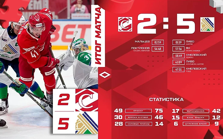 «Салават Юлаев» в матче ФОНБЕТ регулярного чемпионата КХЛ на выезде обыграл «Спартак» со счётом 5:2.