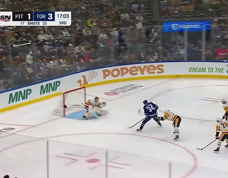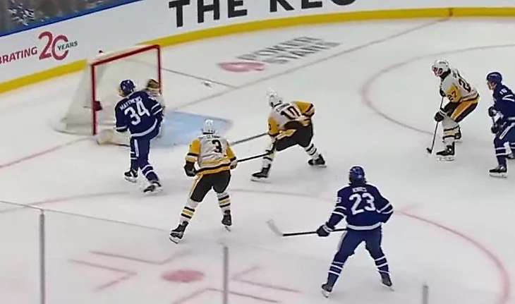 И последние несколько моментов из последнего матча с Пингвинами. Начнем с двух нереализованных выходов 1 на 1, которые Блумквист легко отразил – не получилось у Мэттьюса ударить точно.
