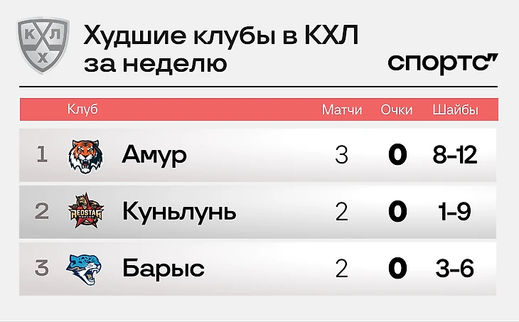 ● «Барыс» по-прежнему сохраняет статус худшей команды лиги, набрав 7 очков в 17 играх. Затеянная перестройка в клубе никак не помогает. На неделе «Барыс» проиграл «Салавату» (2:3) и «Локомотиву» (1:3).