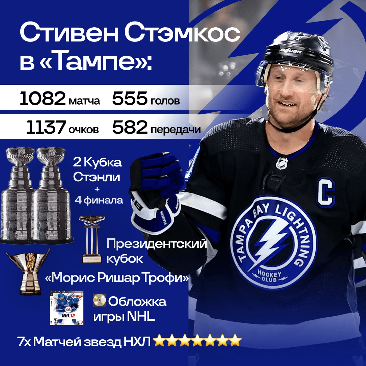 Такое отношение к Стэмкосу в Тампе абсолютно понятно. Он легенда клуба. Нападающий, выбранный первым на драфте НХЛ-2008, стал рекордсменом «Лайтнинг» по матчам, голам и очкам. 11 лет он был капитаном клуба – и за это время команда 4 раза выходила в финал, дважды взяв кубок.