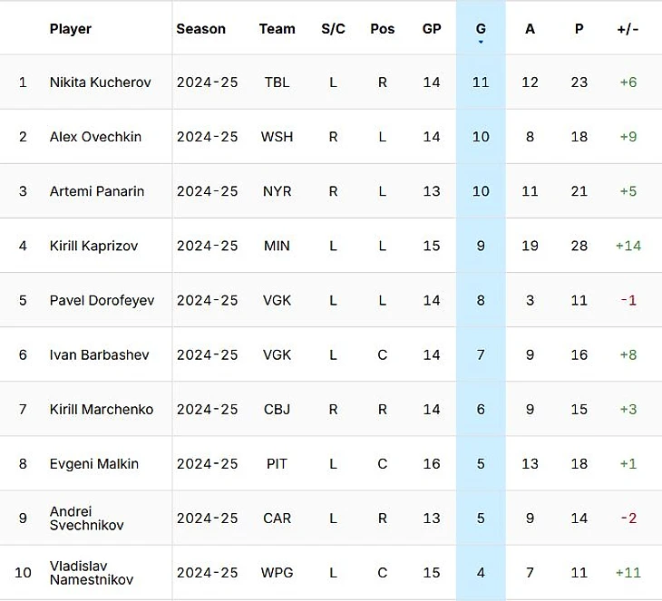 В топ-50 всей лиги на данный момент располагается 7 российских нападающих. Все они пока идут по графику больше одного очка за игру.