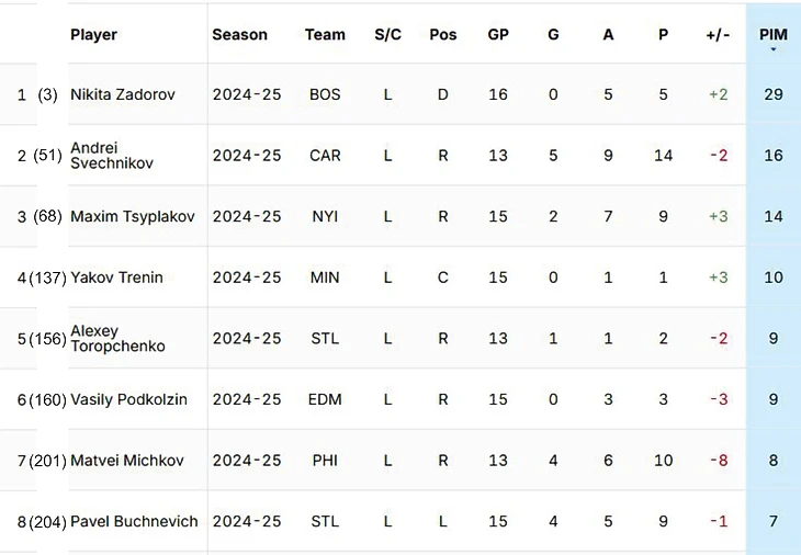 В таблице привел топ-8 так как у 6 следующих игроков по 6 минут штрафа (по 3 двухминутных удаления).