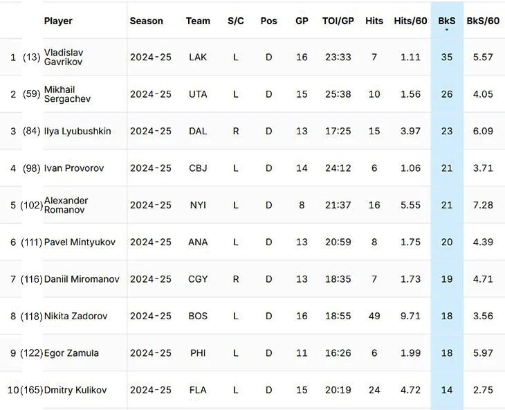 Лидером по абсолютным показателям заблокированных бросков остается Владислав Гавриков, у которого 35 блоков за 16 матчей. В тройку также входят Михаил Сергачев (26 блоков за 15 матчей) и Илья Любушкин (23 блока за 13 матчей). К слову, в топ-10 находятся только защитники.