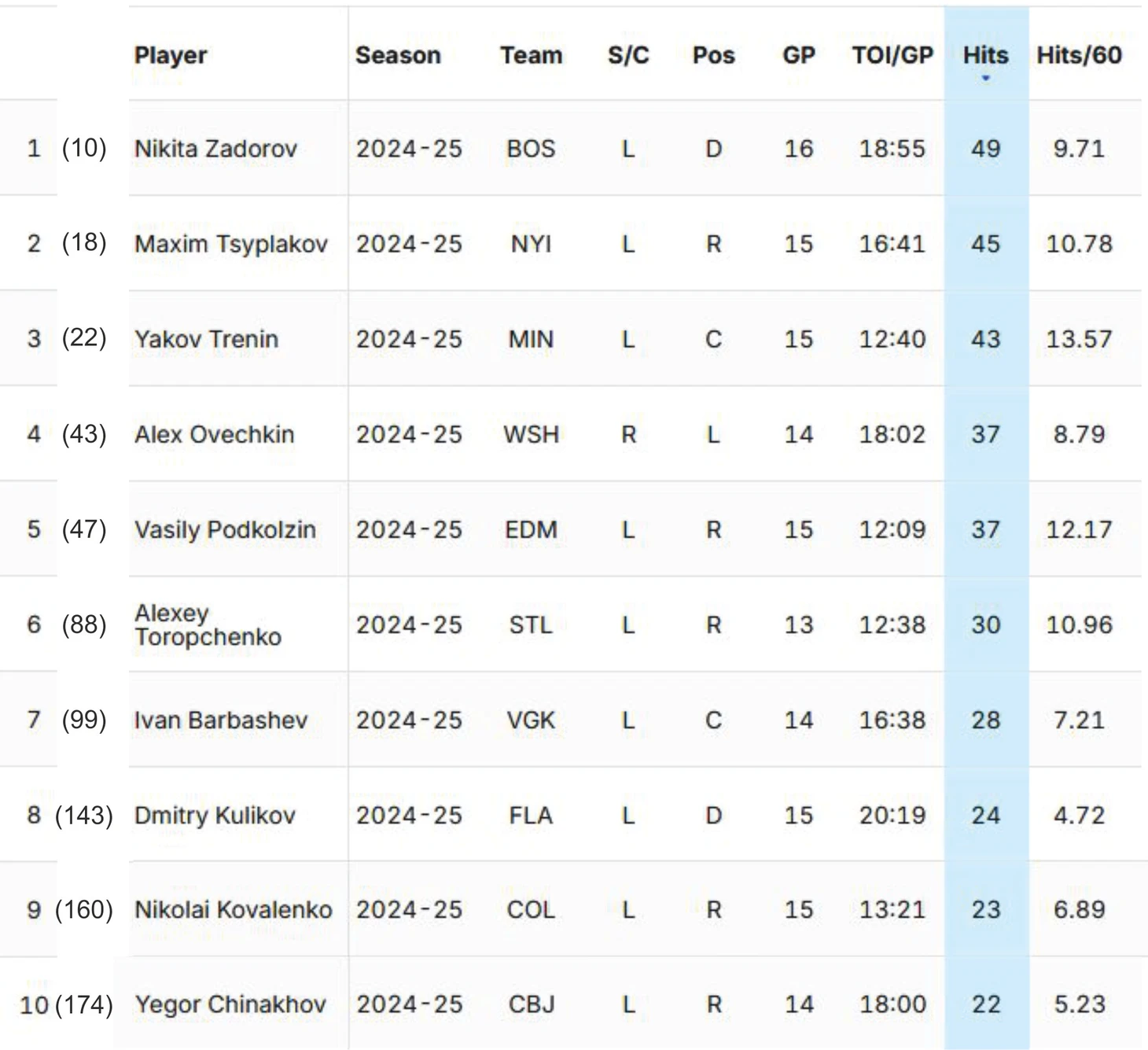 По показателю силовые приемы на 60 минут топ-5 лидеров выглядит по-другому: 1) Яков Тренин с 13.57 (43 хита, 15 матчей); 2) Клим Костин 12.39 (12 хитов, 7 матчей); 3) Василий Подколзин 12.17 (37 хитов, 15 матчей); 4) Алексей Торопченко 10.96 (30 хитов, 13 матчей); 5) Никита Прищепов 10.80 (6 хитов, 4 матча).