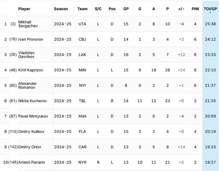 Лидером по игровому времени среди наших игроков остается Михаил Сергачев, который занимает первую строчку с первого матча. В общем списке НХЛ он идет 3 уступая лишь Заку Веренски («Коламбус», 25:42) и Сету Джонсу («Чикаго», 25:41). В топ-10 среди наших входит всего 3 форварда: Кирилл Капризов (22:10), Никита Кучеров (21:35) и Артемий Панарин (19:27).