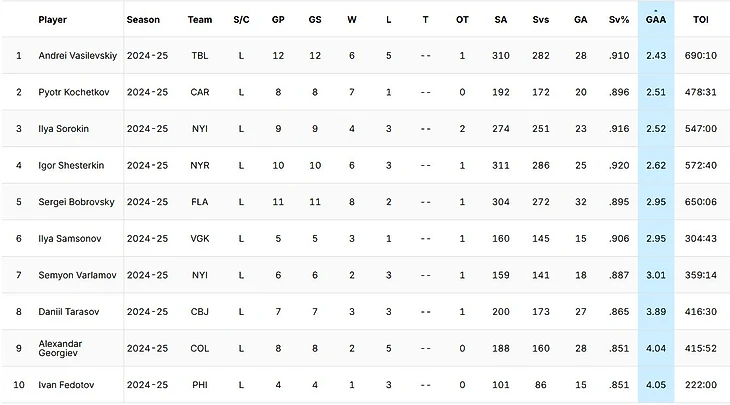 По коэффициенту надежности на первое место вышел Андрей Василевский с показателем 2.43. На втором месте Петр Кочетков с 2.51 и замыкает тройку Илья Сорокин 2.52.