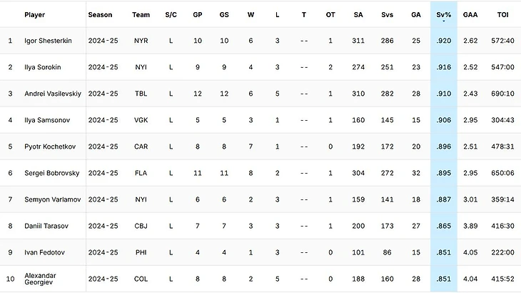 По сравнению с прошлой неделей тройка лидеров по проценту отраженных бросков не изменилась – первый Игорь Шестеркин (92.0 %), второй Илья Сорокин (91.6 %), третий Андрей Василевский (91.0 %).