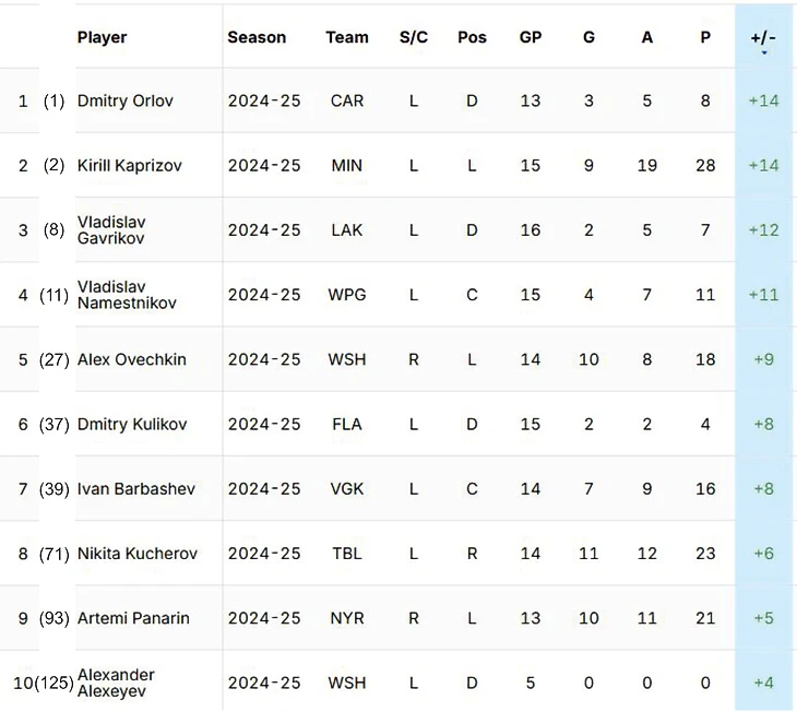 Дмитрий Орлов и Кирилл Капризов лидируют во всей лиге по показателю полезности, они оба имеют +14. На третье место вышел Владислав Гавриков (+12), который с «Лос-Анджелес Кингз» провел удачную неделю, только за прошедшую неделю Гавриков заработал +6.