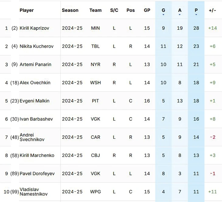 Кирилл Капризов увеличил отрыв в списке бомбардиров, у него 28 (9+19) очков после 15 матчей. Тройка лидеров осталась прежней: Кирилл Капризов, Никита Кучеров (23 очка за 14 матчей) и Артемий Панарин (21 очко в 13 матчах). В десятку лучших бомбардиров вошел Владислав Наместников, у которого 11 (4+7) очков за 15 матчей в «Виннипеге».