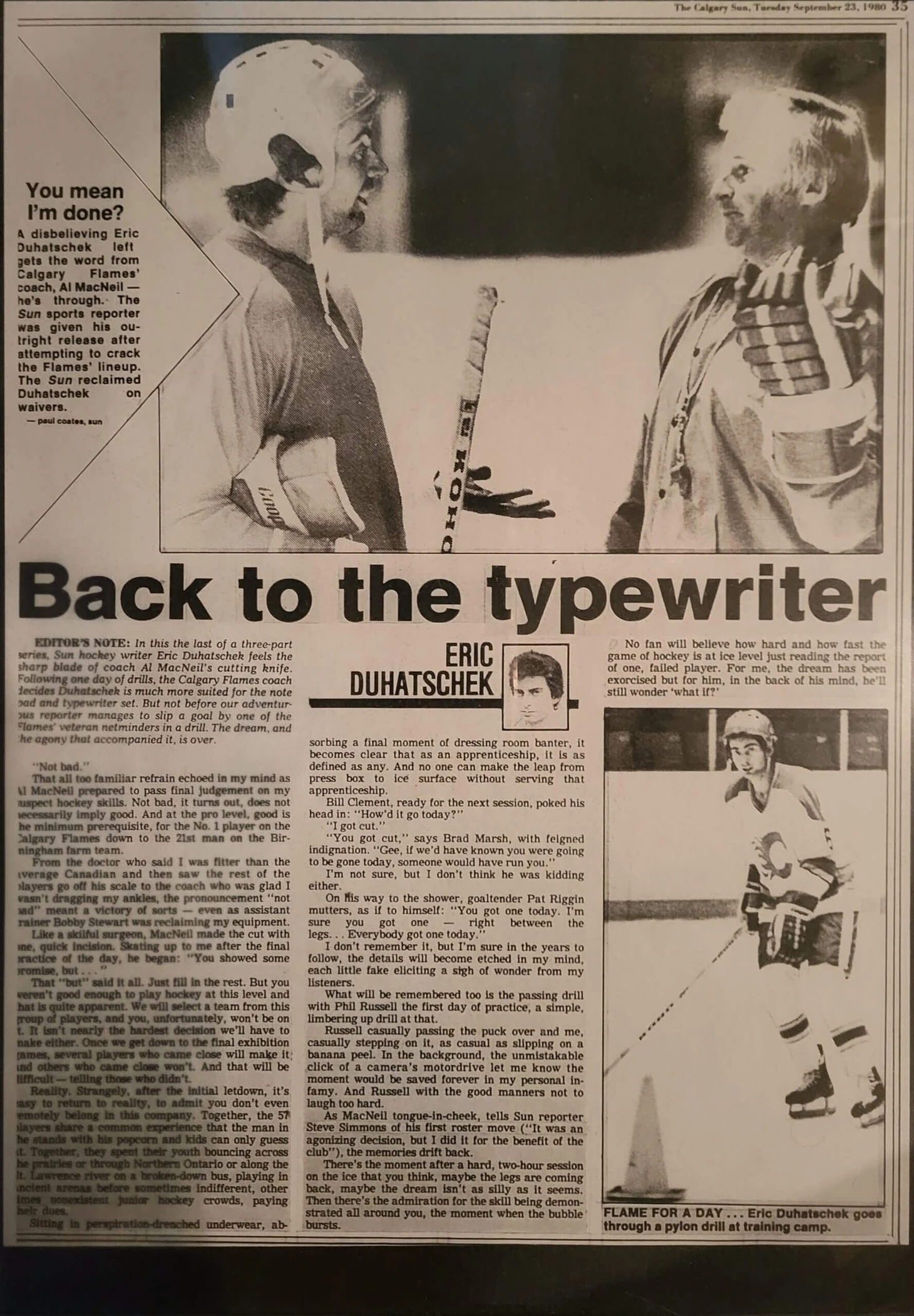 В 1980-ом, когда «Flames» переехали из Атланты в Калгари, «Albertan» закрылся и был заменен «Sun». Руководство прислало нового редактора из Торонто, который верил в журналистику участия, популяризированную известным писателем Джорджем Плимптоном. Соответственно, редактор попросил меня попробовать себя в «Flames» в роли хоккеиста, и, к моему большому удивлению, генеральный менеджер Клифф Флетчер согласился.