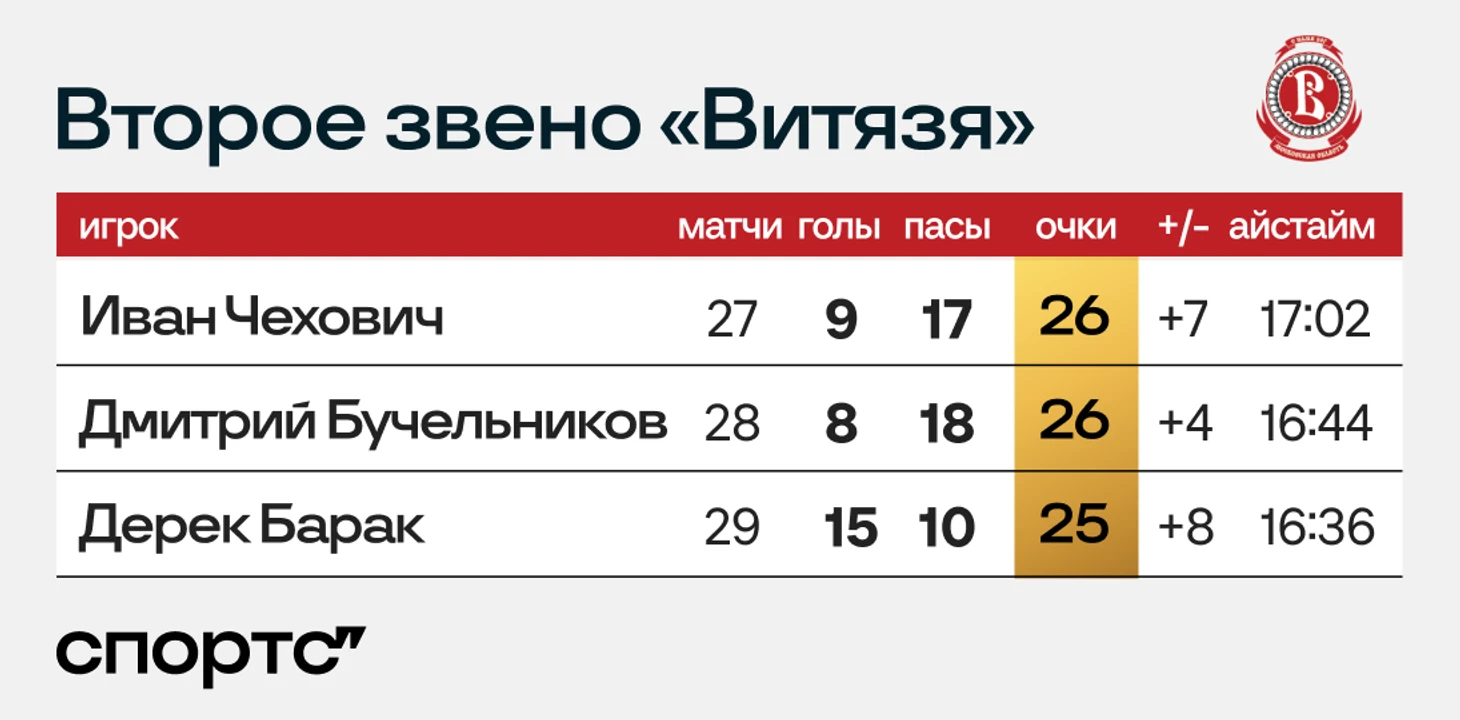 ● Чехович, Бучельников и Барак набрали 77 очков – у всех остальных игроков «Витязя» в сумме 107.
