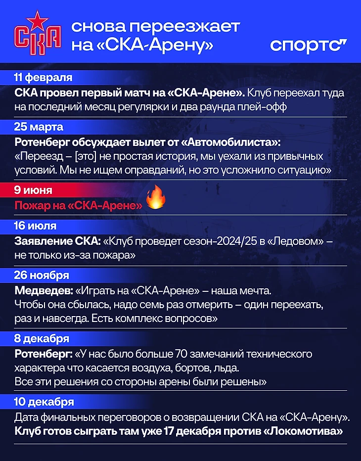 5. Через месяц СКА сделал заявление и напрямую объяснил: матчи сезона-2024/25 пройдут в «Ледовом». В нем же перечислялось: «Надеемся, что в последующих сезонах необходимые технические, организационные, финансовые и коммерческие условия будут созданы и для возможного использования Арены на проспекте Юрия Гагарина». Вероятно, справились раньше.