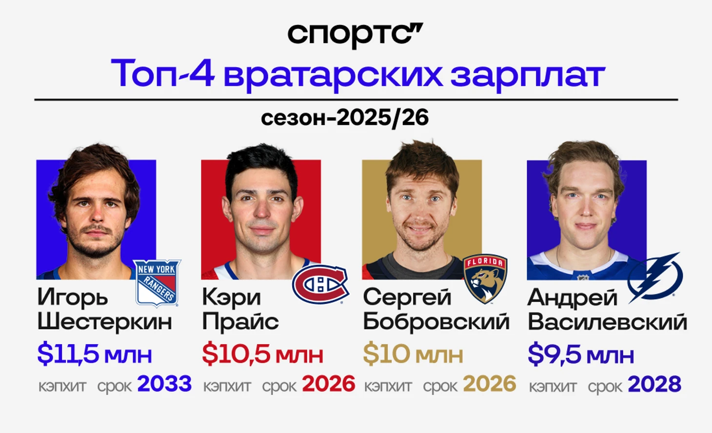 В топ-4 вратарей НХЛ по зарплате сейчас аж трое наших (и один неиграющий Прайс). И, во-первых, дико смешно, что это раздолье, которым сборная России не воспользовалась бы, даже если бы могла – потому что на лед выходит только один вратарь.
