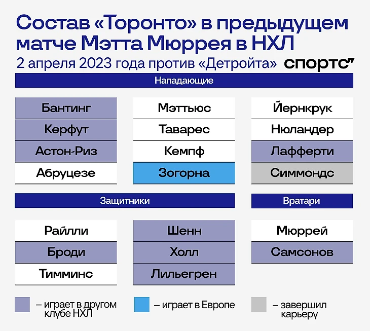 Предыдущий матч Мюррея в НХЛ состоялся 2 апреля 2023 года. Тогда «Торонто» проиграл «Детройту» (2:5), а Мэтт покинул лед досрочно из-за травмы.