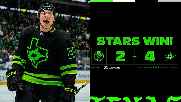 «Даллас Старз»-»Буффало Сэйбрз» 4:2. Джейсон Робертсон набрал 3 очка (1+2), Томас Харли отдал 2 результативные передачи, Кейси ДеСмит отразил 21 бросок.