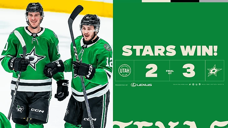«Даллас Старз»-»Юта» 3:2 (ОТ). Томас Харли в овертайме принёс победу хозяевам. Уайтт Джонстон и Мэтт Дюшен отдали по 2 результативные передачи, Джэк Оттинджер отразил 33 броска. У гостей Матиас Маккелли забросил 2 шайбы. «Звёзды» выиграли 4 игру подряд.