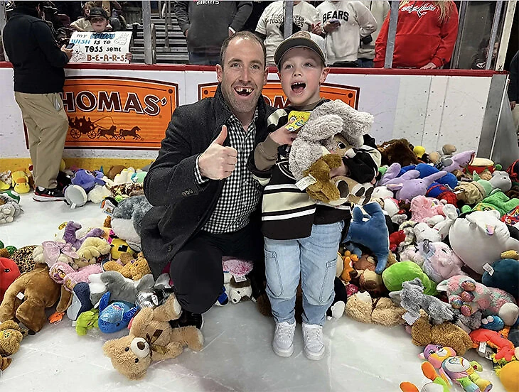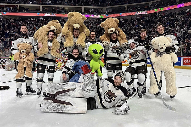 Итэн Бир (на английском – Ethan Bear) из «Херши Бирс» (Hershey Bears) в окружении плюшевых медведей в день Teddy Bear Toss – та тавтология, ради которой уже стоило проводить акцию.
