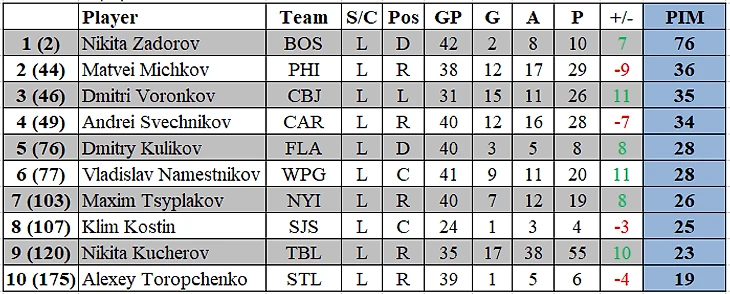 В десятку входит 3 защитника: Задоров, Александр Романов (71 хит в 29 матчах) и Дмитрий Куликов (67 хитов за 40 матчей)