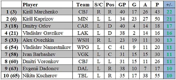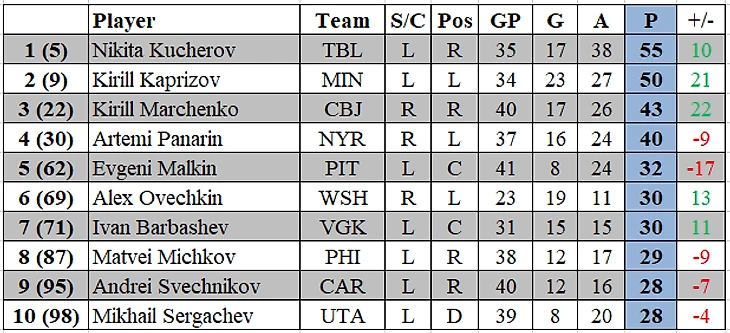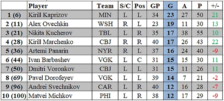 Тройка наших лучших бомбардиров не изменилась с прошлой недели: 1) Никита Кучеров с 55 (17+38) очками в 35 матчах, 2) Кирилл Капризов 50 (23+27) очков в 34 матчах и 3) Кирилл Марченко 43 (17+26) очка в 40 матчах.