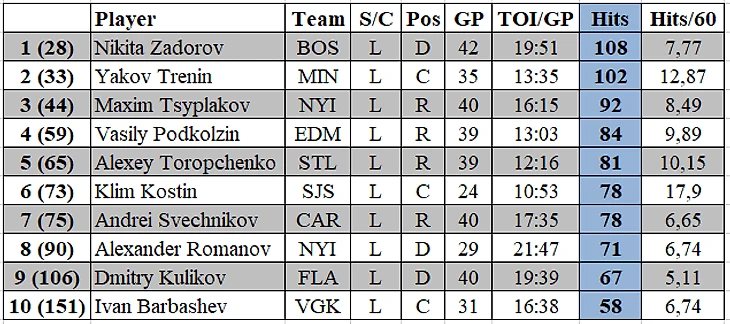 По количеству силовых приемов лидером среди наших является Никита Задоров, который сделал уже 108 хитов за 42 матча. Тройка лидеров по абсолютным показателям выглядит следующим образом: 1) Никита Задоров; 2) Яков Тренин 102 хита за 35 матчей; 3) Максим Цыплаков 92 хита за 40 матчей.