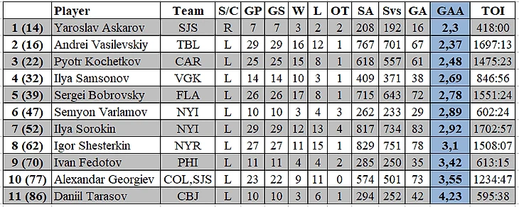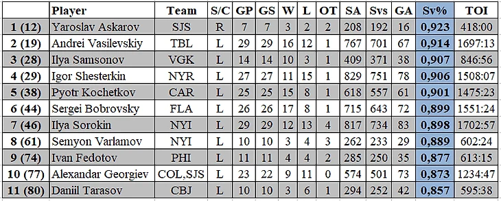 По проценту отраженных бросков среди наших вратарей пока лучшим остается Ярослав Аскаров, который после 7 матчей в составе «Сан-Хосе» имеет 92.3 % отраженных бросков (при 3 победах).