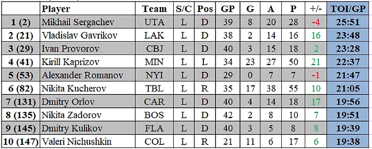 Лидером по игровому времени среди наших игроков остается Михаил Сергачев, который занимает первую строчку с первого матча. В общем списке НХЛ он идет 2 уступая лишь Заку Веренски («Коламбус», 26:28).