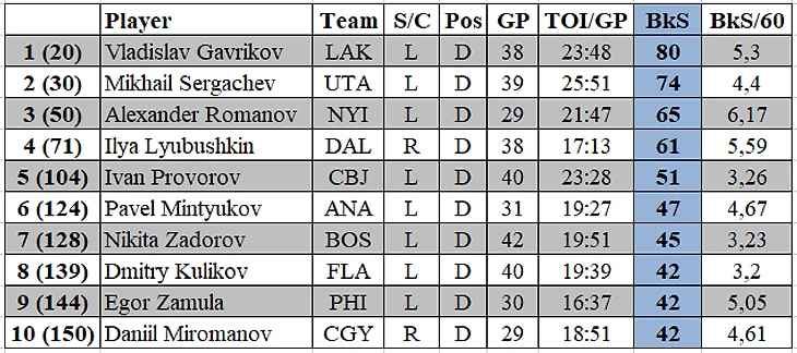 Единоличным лидером по заблокированным броскам среди наших игроков является Владислав Гавриков, у которого уже 80 блоков в 38 матчах. Вторую строчку занимает Михаил Сергачев с 74 блоками в 39 матчах. На третьем месте расположился Александр Романов с 65 заблокированными бросками в 29 матчах.