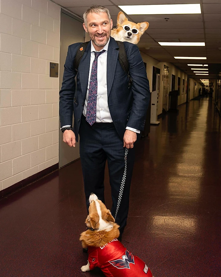 Овечкин появился перед матчем в компании двух интернет-звезд – корги Максины и Хэмми. У одной – 1,3 млн подписчиков в соцсетях, у другого – 2 млн (для сравнения: у самого хоккеиста в инстаграме – 1,6 млн). В общем, встретились селебрити своих биологических видов.