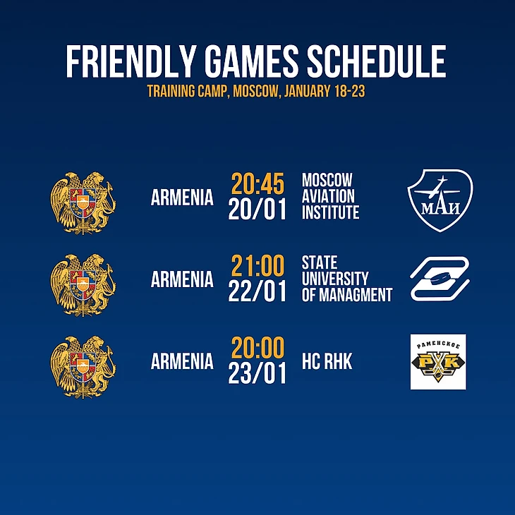 В Москве сборная Армении будет тренироваться до 23 января, а также проведет три товарищеских матча: против сборной Московского авиационного института (20 января), сборной Государственного университета управления (21 января), а также против ХК РХК, выступающей в Ночной хоккейной лиге (23 января).