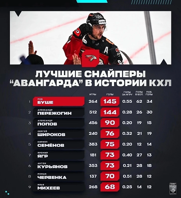 Хоккеиста с таким снайперским талантом до Буше в «Авангарде» не было, при всём уважении к другим потрясающим игрокам. Цифры говорят сами за себя, Буше забил 145 голов всего за 264 игры, и посмотрите, сколько понадобилось матчей для достижения такого результата тому же Пережогину. Похожая продуктивность была у Романа Червенки, но чешский снайпер провёл за «Авангард» лишь два сезона. И всё равно уступил Буше по среднему количеству голов за игру.