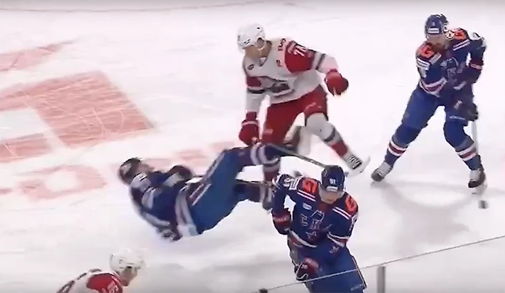 Все началось еще в середине первого периода. Максим Шалунов провел мощный силовой против капитана СКА Александра Никишина. Нападающий «Локомотива» подпрыгнул и плечом угодил прямо в голову Никишину.