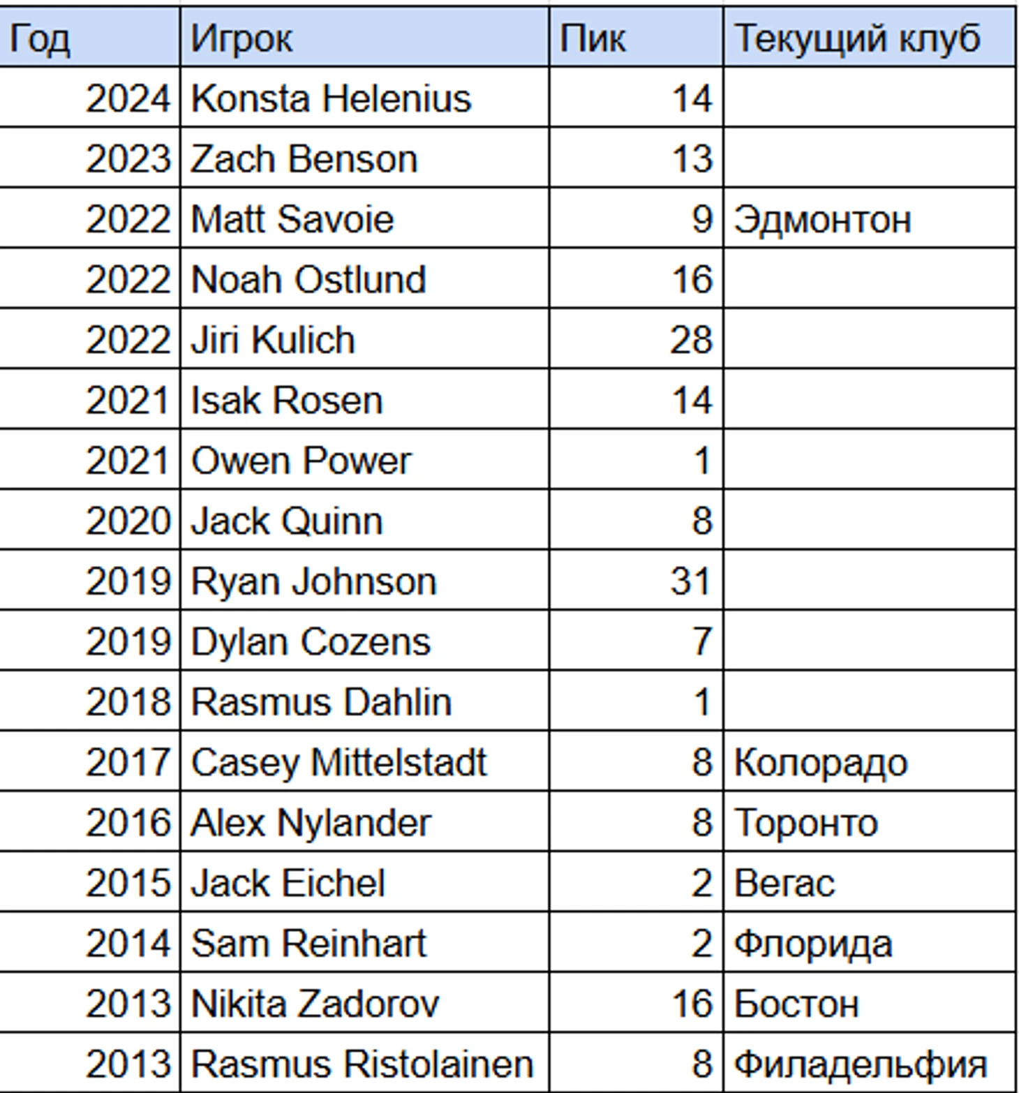 «Баффало» пропускают плей-офф 13 лет подряд, что является самой длинной серией в НХЛ. После многочисленных неудачных попыток сделать следующий шаг новое руководство и персонал выбрали более медленный и терпеливый подход. Хотя, куда уж медленнее. За последние 10 лет высоких выборов в первом раунде драфта было предостаточно, но не так то много игроков осталась с тех драфтов. И руководство и тренеры «клинков» не могли сделать небольшой шаг даже для борьбы за попадание в плей-офф, хотя временами казалось что вот-вот и их прорвёт. Но прорыва не случалось, были лишь разочарования. Вокруг Айкела выстроить не получилось, теперь на смену пришли новые перспективные ребята. И, кажется, что их терпение может быть тоже на исходе. Болельщики «Баффало» точно самые терпеливые и тешат себя надеждой что впереди их ждёт расцвет команды. Ниже статистика драфтов «Баффало» за последние 12 лет в первом раунде и видим что все кого драфтовали до 2018го уже не в команде. И здесь вопрос не в игроках, а скорее в структуре команды или каких-то внутренних процессах…