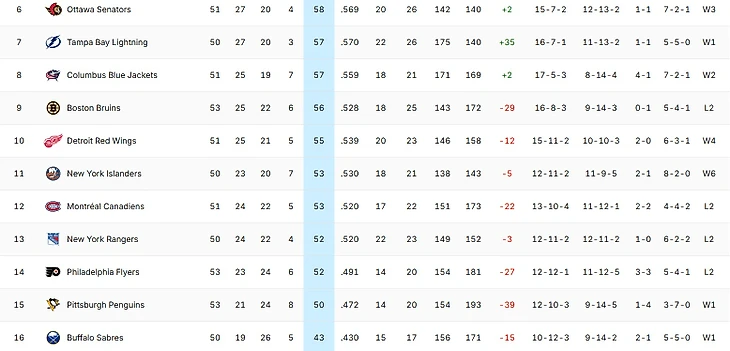 Можем просто зайти в таблицу и глянуть кто из команд находится выше, но ситуация на Востоке ситуация слишком динамично меняется. Очевидно что «Баффало» в этом сезоне уже идёт за первыми пиками драфта и никакой плей-офф не светит. Плюс ко всему они могут быть довольно активны на дедлайне (переход Элиаса Петтерссона в «Баффало» реален?) и уже быть одной из интригующих банд следующего сезона.